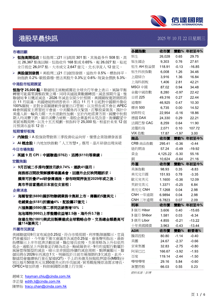 信达国际-港股早晨快讯-251022