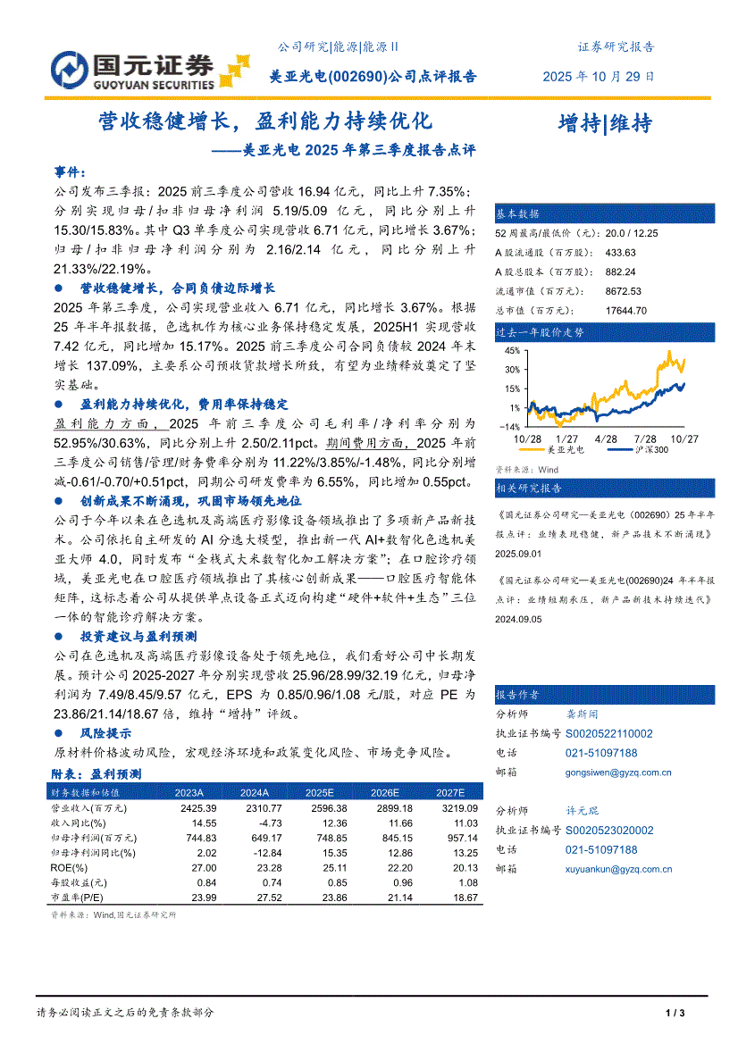 美亚光电:国元证券-美亚光电-002690-2025年第三季度报告点评:营收稳健增长,盈利能力持续优化-251029