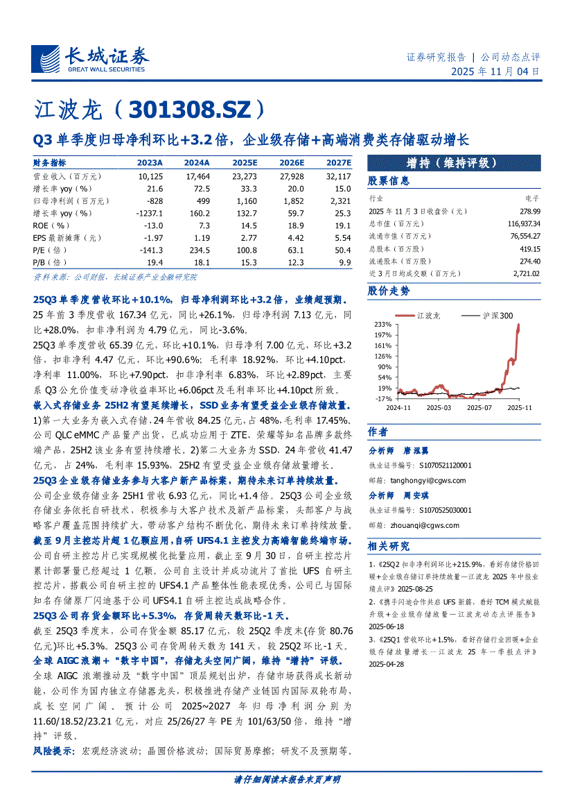 江波龙:长城证券-江波龙-301308-Q3单季度归母净利环比+3.2倍,企业级存储+高端消费类存储驱动增长-251104