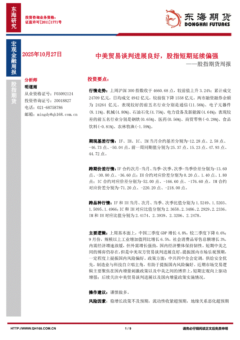 东海期货-股指期货周报:中美贸易谈判进展良好,股指短期延续偏强-251027