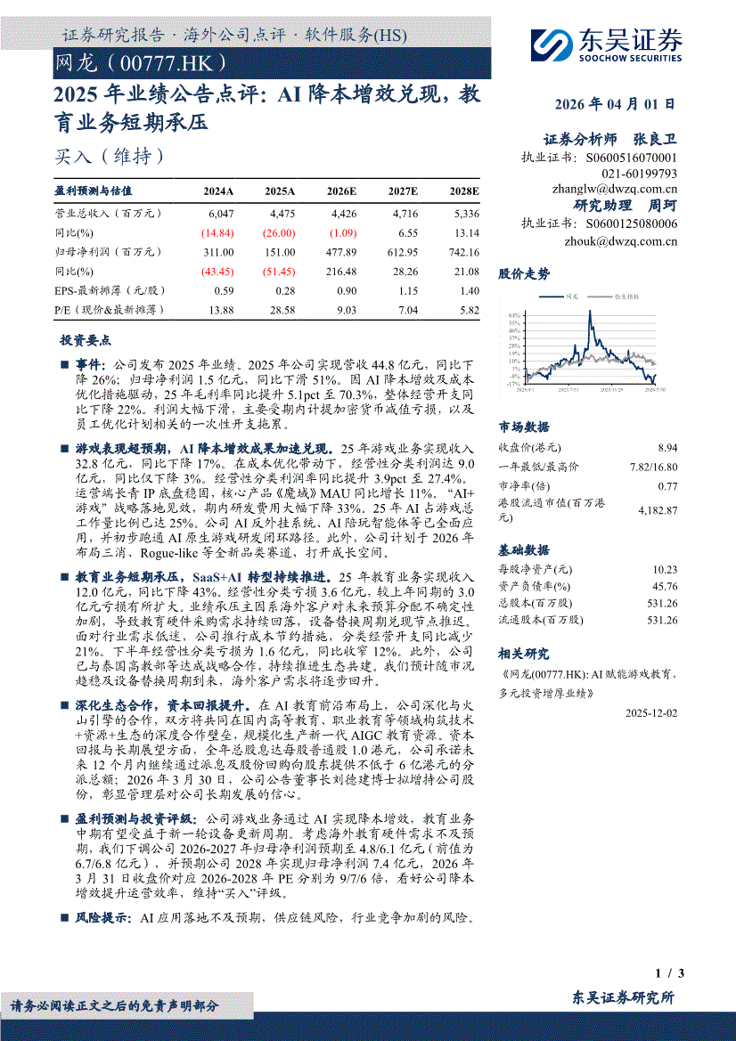 网龙:东吴证券-网龙-0777.HK-2025年业绩公告点评:AI降本增效兑现,教育业务短期承压-260401