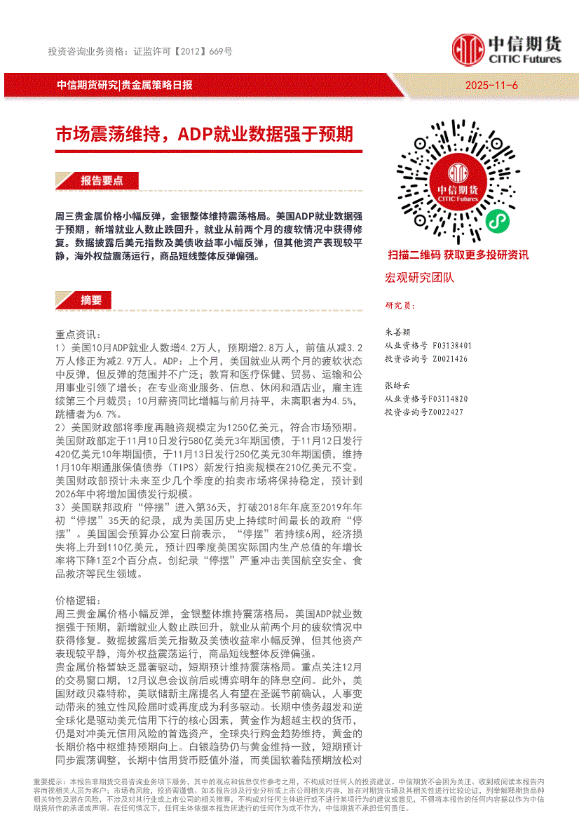 中信期货-贵金属策略日报:市场震荡维持,ADP就业数据强于预期-251106