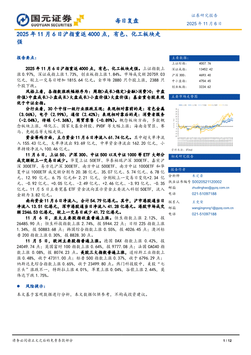 国元证券-每日复盘:2025年11月6日沪指重返4000点,有色、化工板块走强-251106