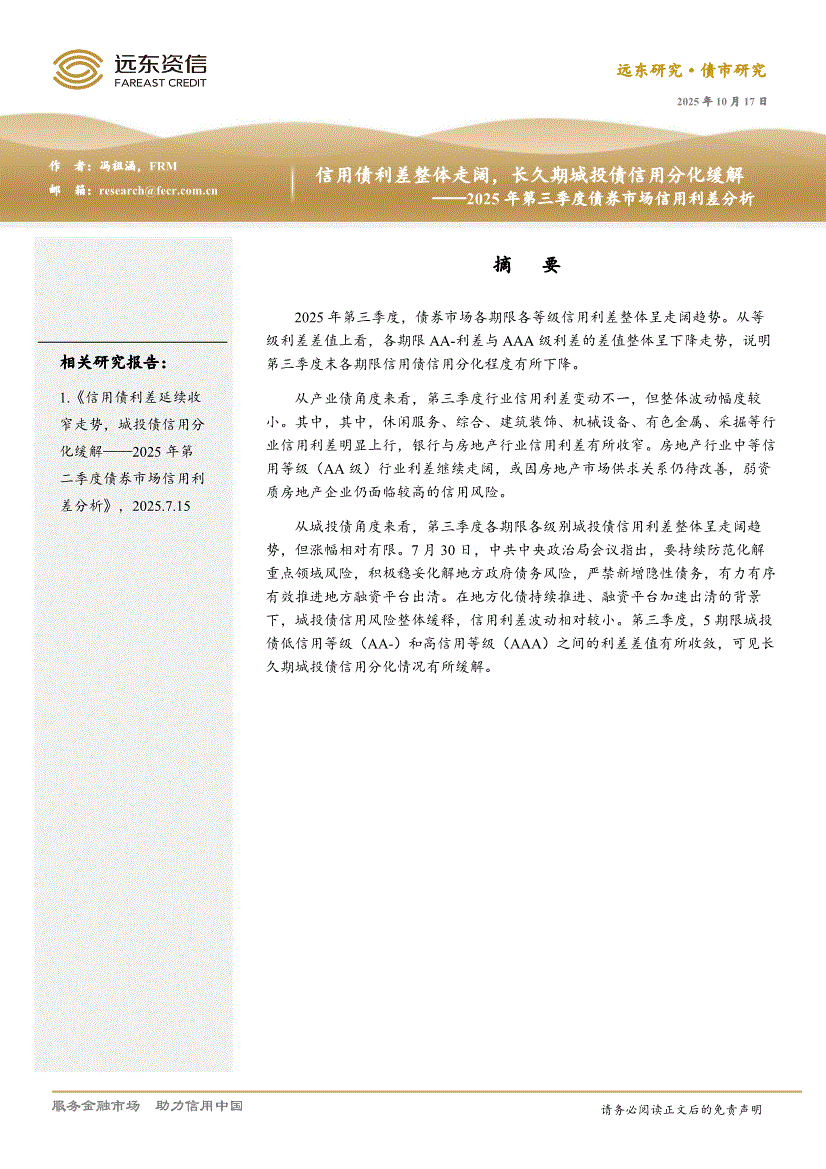 远东资信-2025年第三季度债券市场信用利差分析:信用债利差整体走阔,长久期城投债信用分化缓解-251017