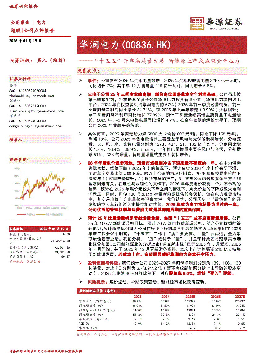 华润电力:华源证券-华润电力-0836.HK-“十五五”开启高质量发展,新能源上市或减轻资金压力-260119