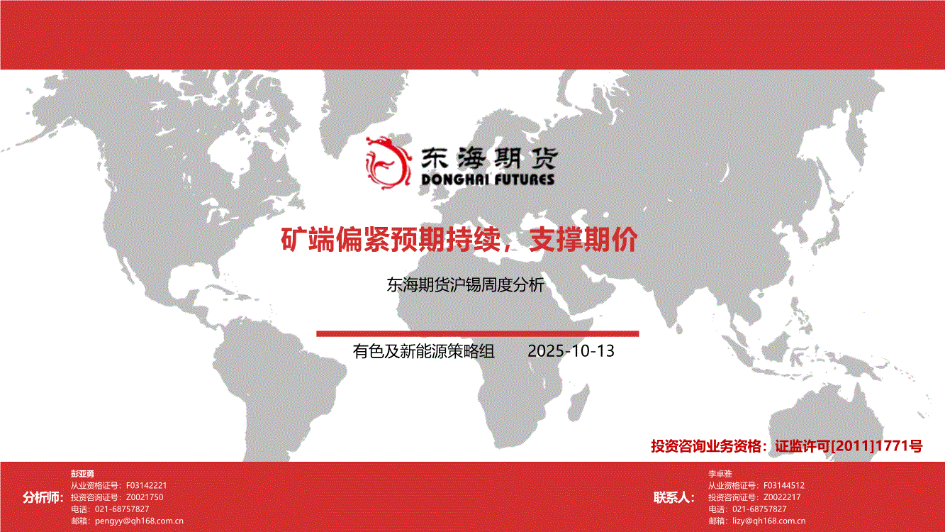 东海期货-沪锡周度分析:矿端偏紧预期持续,支撑期价-251013