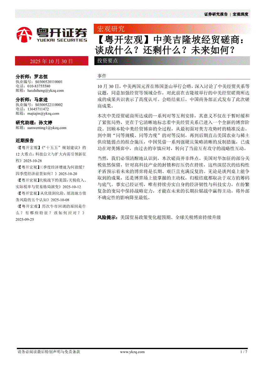 粤开证券-【粤开宏观】中美吉隆坡经贸磋商:谈成什么?还剩什么?未来如何?-251030