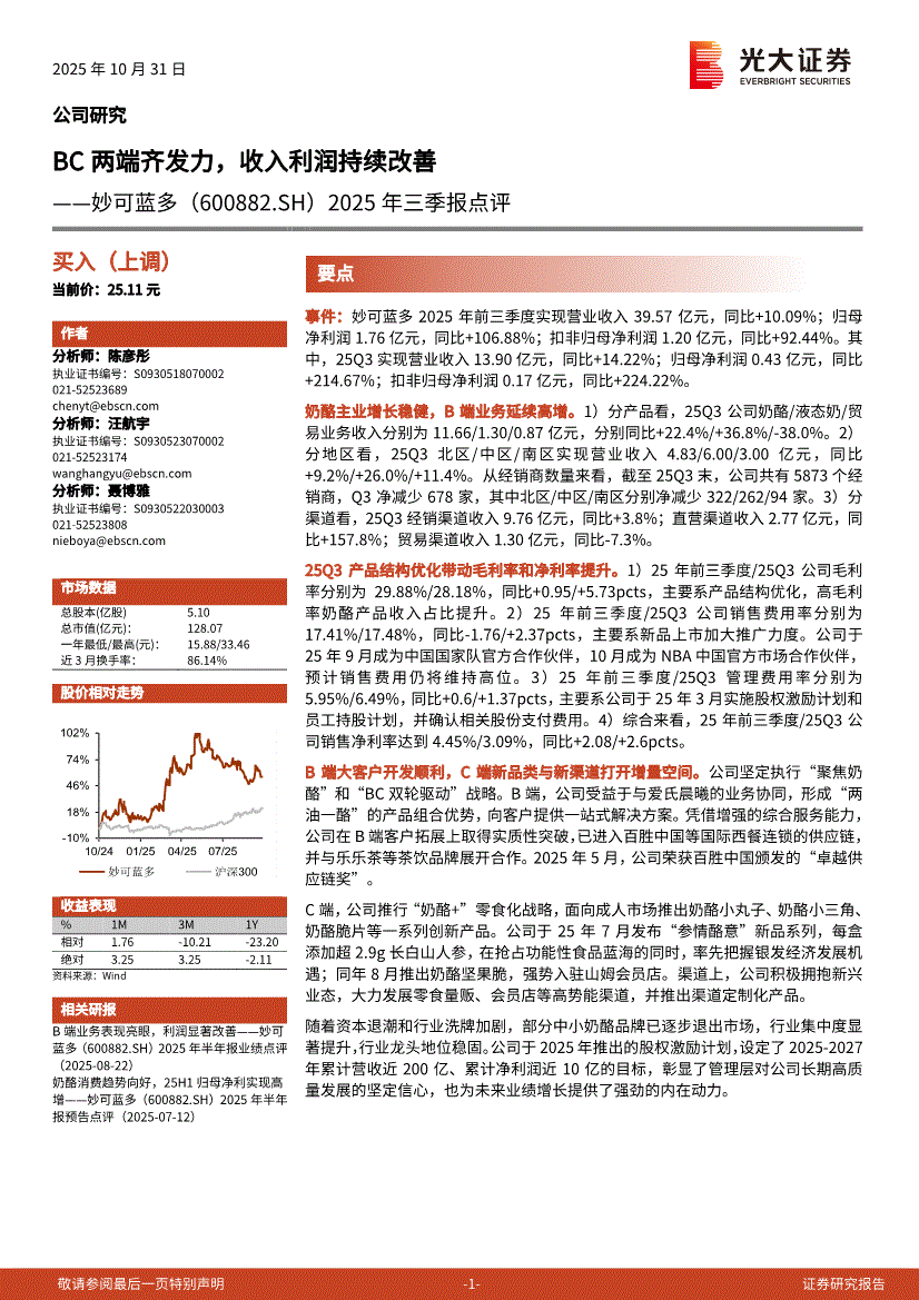 妙可蓝多:光大证券-妙可蓝多-600882-2025年三季报点评:BC两端齐发力,收入利润持续改善-251031