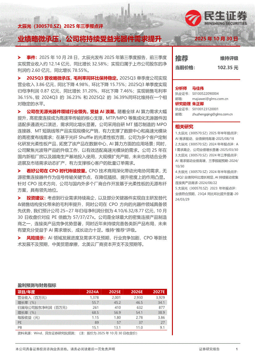 太辰光:民生证券-太辰光-300570-2025年三季报点评:业绩略微承压,公司将持续受益光器件需求提升-251030