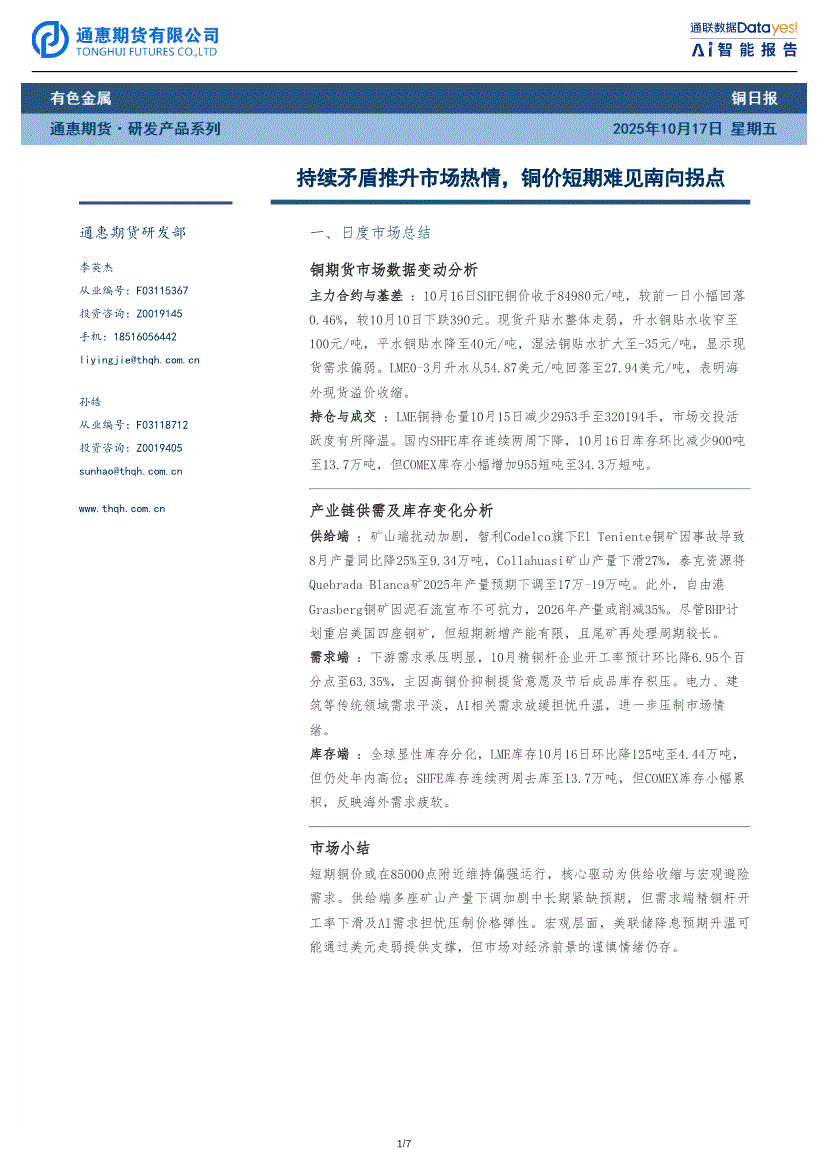 通惠期货-铜日报:持续矛盾推升市场热情,铜价短期难见南向拐点-251017