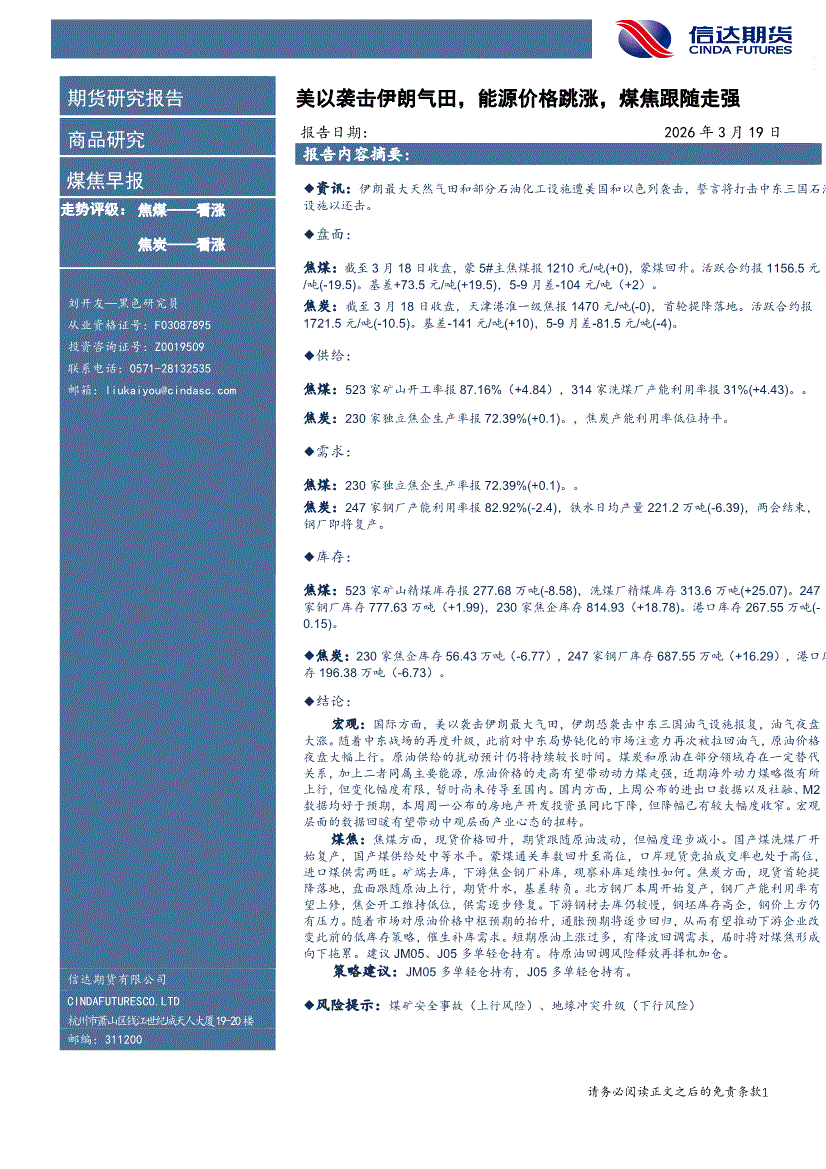 信达期货-煤焦早报:美以袭击伊朗气田,能源价格跳涨,煤焦跟随走强-260319