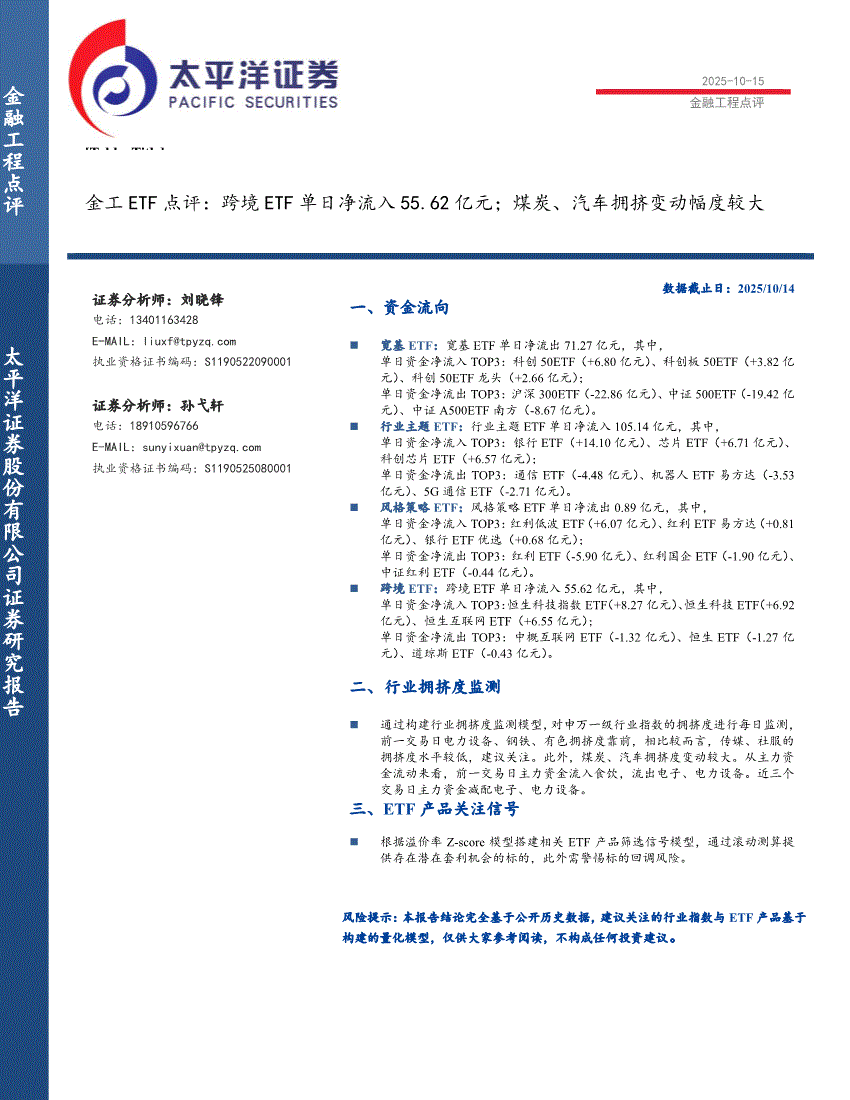 太平洋证券-金工ETF点评:跨境ETF单日净流入55.62亿元;煤炭、汽车拥挤变动幅度较大-251015