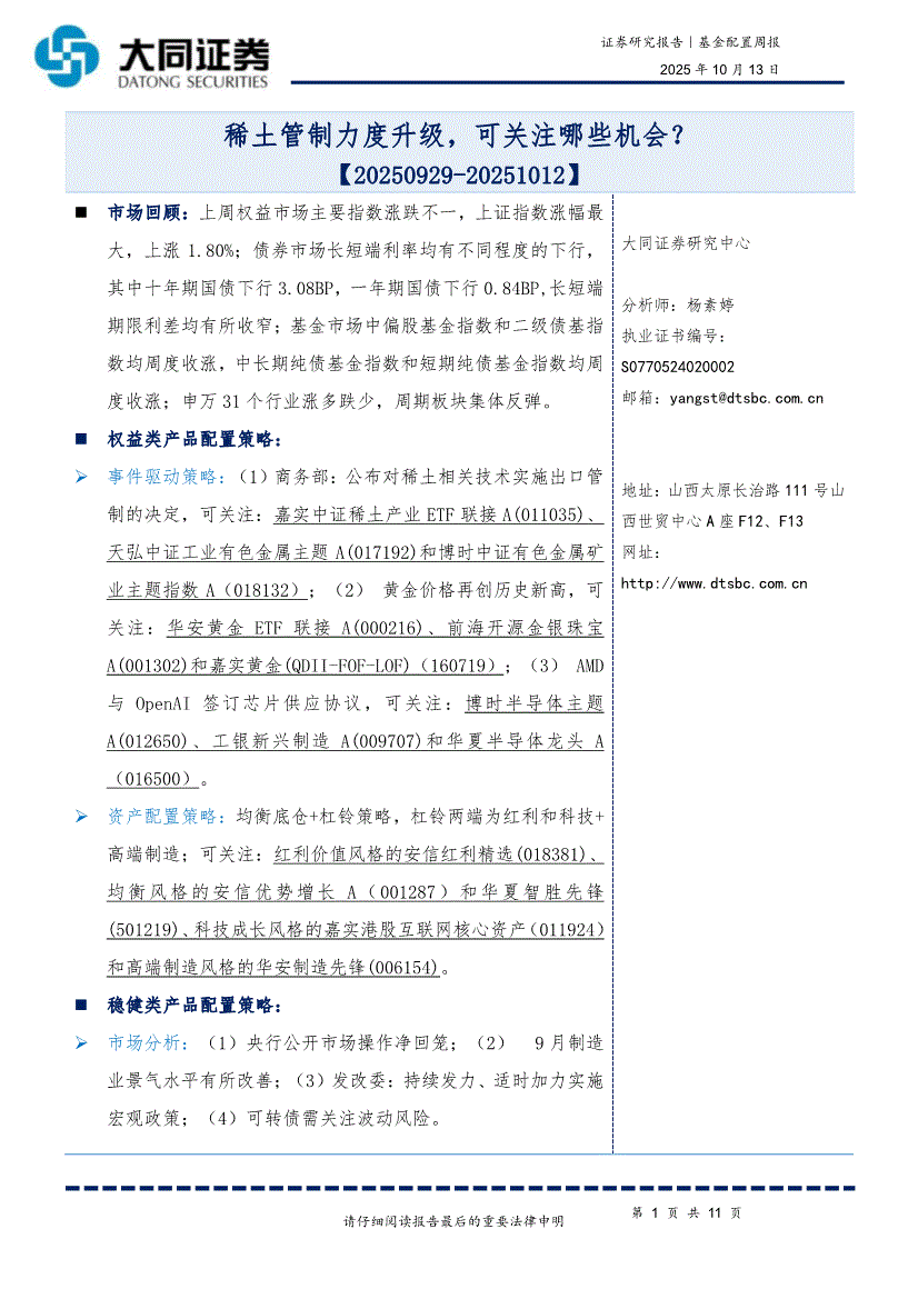 大同证券-基金配置周报:稀土管制力度升级,可关注哪些机会?-251013