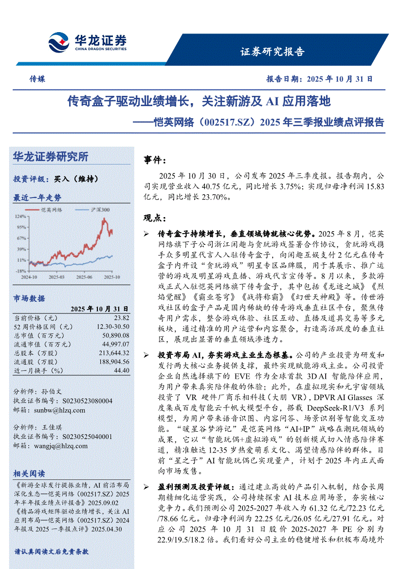 恺英网络:华龙证券-恺英网络-002517-2025年三季报业绩点评报告:传奇盒子驱动业绩增长,关注新游及AI应用落地-251031