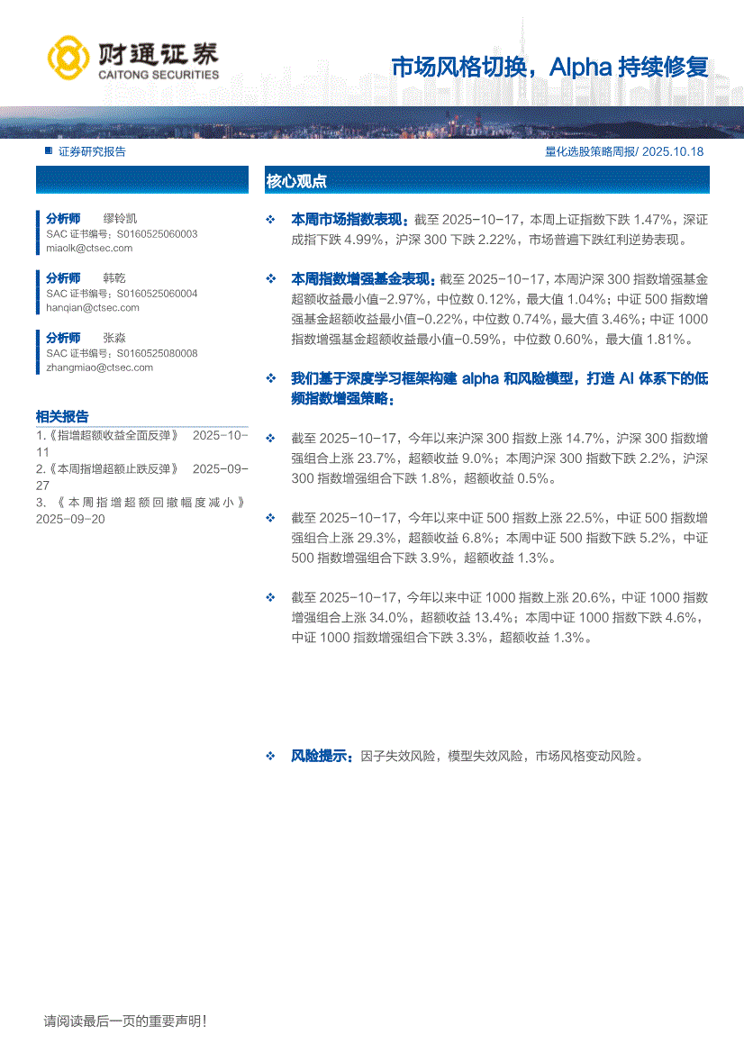 财通证券-量化选股策略周报:市场风格切换,Alpha持续修复-251018