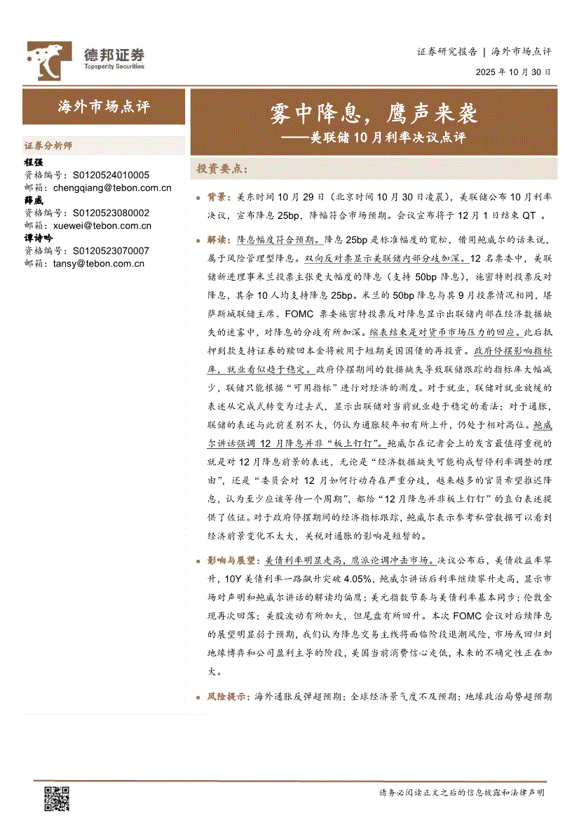 德邦证券-美联储10月利率决议点评:雾中降息,鹰声来袭-251030