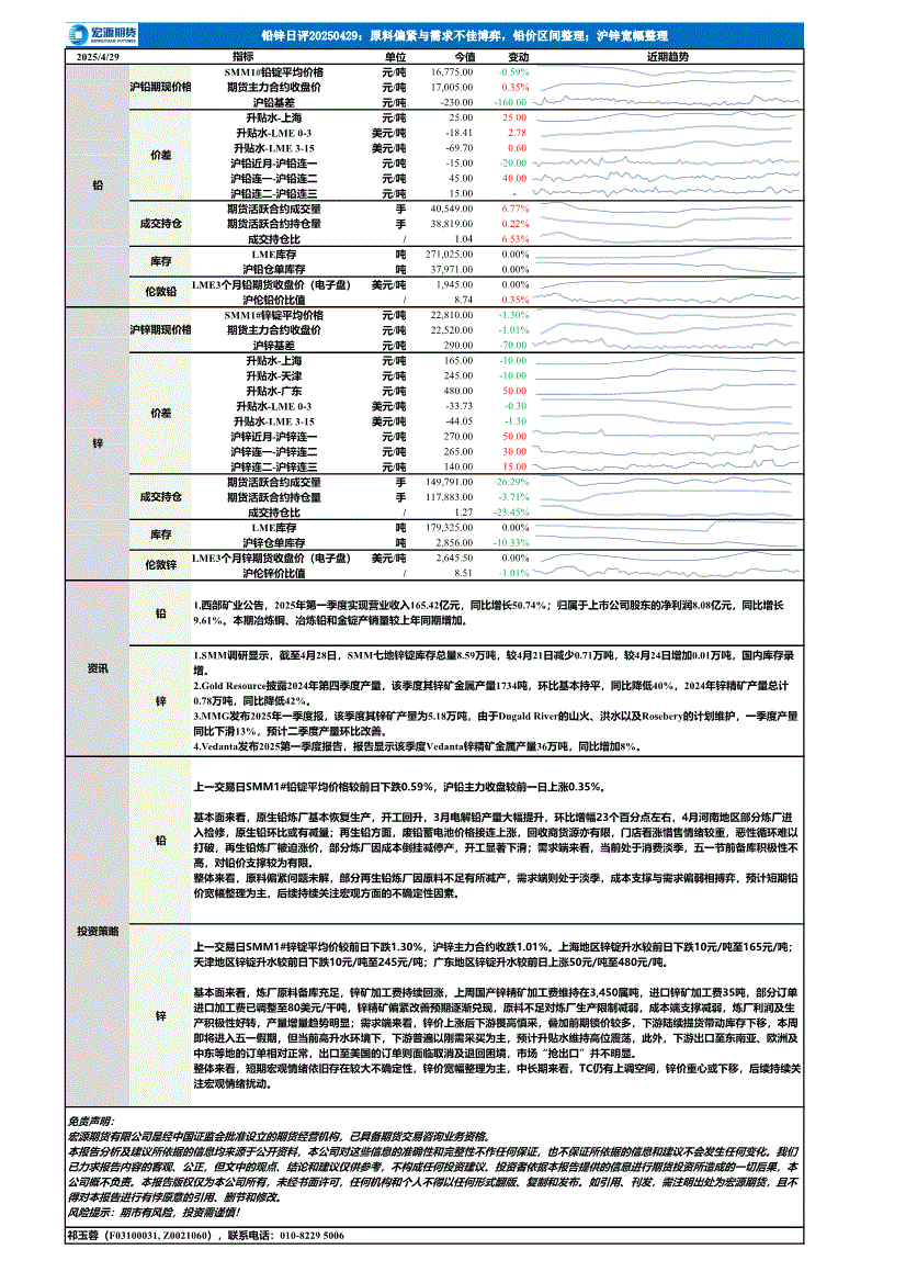 宏源期货-铅锌日评:原料偏紧与需求不佳博弈,铅价区间整理;沪锌宽幅整理-250429