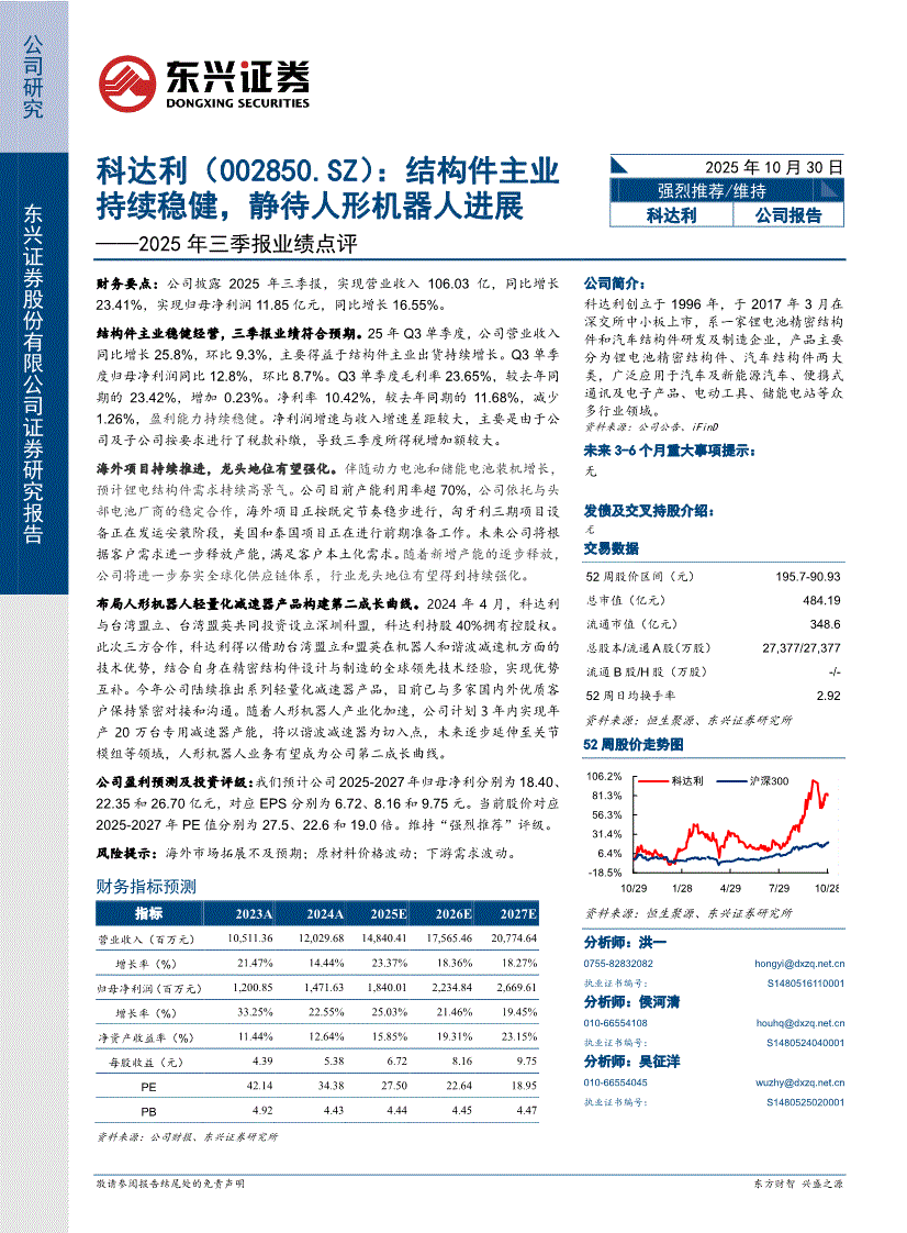 科达利:东兴证券-科达利-002850-2025年三季报业绩点评:结构件主业持续稳健,静待人形机器人进展-251030