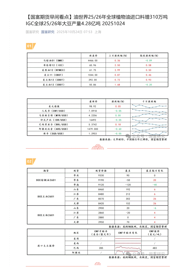 国富期货-【早间看点】油世界25/26年全球植物油进口料增310万吨,IGC全球25/26年大豆产量4.28亿吨-251024