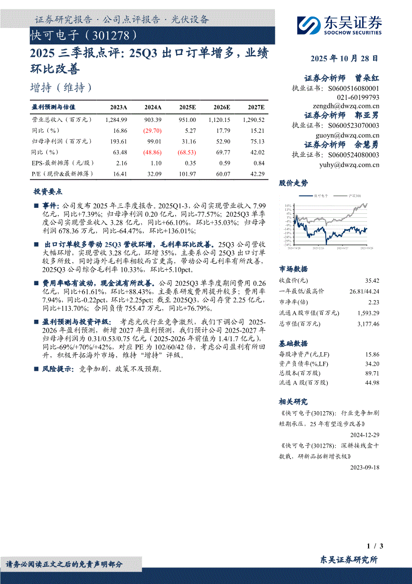 快可电子:东吴证券-快可电子-301278-2025三季报点评:25Q3出口订单增多,业绩环比改善-251028