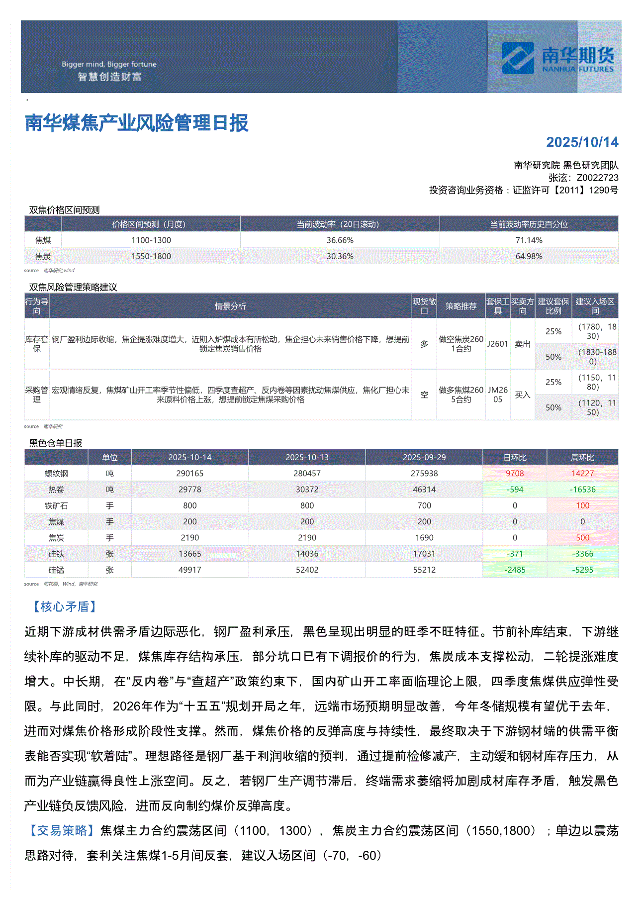 南华期货-南华煤焦产业风险管理日报-251014
