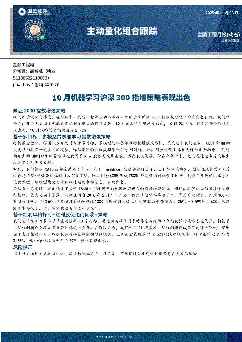 国金证券-主动量化组合跟踪:10月机器学习沪深300指增策略表现出色-251106