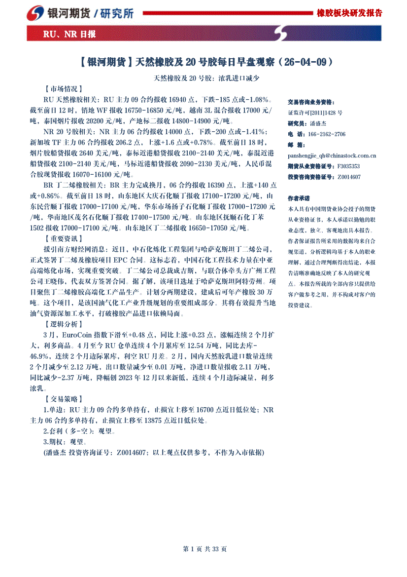 银河期货-天然橡胶及20号胶每日早盘观察-260409