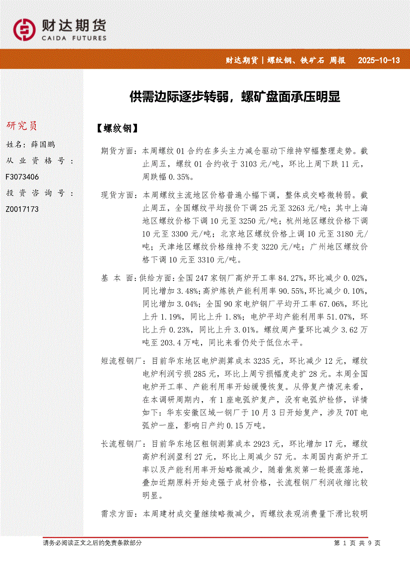财达期货-螺纹钢、铁矿石周报:供需边际逐步转弱,螺矿盘面承压明显-251013