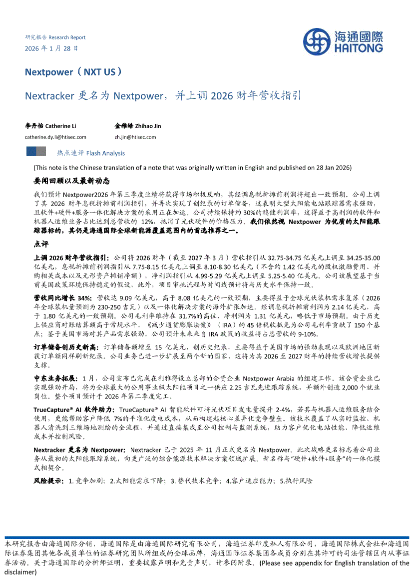 Nextpower:海通国际-Nextpower-NXT.US-Nextracker更名为Nextpower,并上调2026财年营收指引-260128