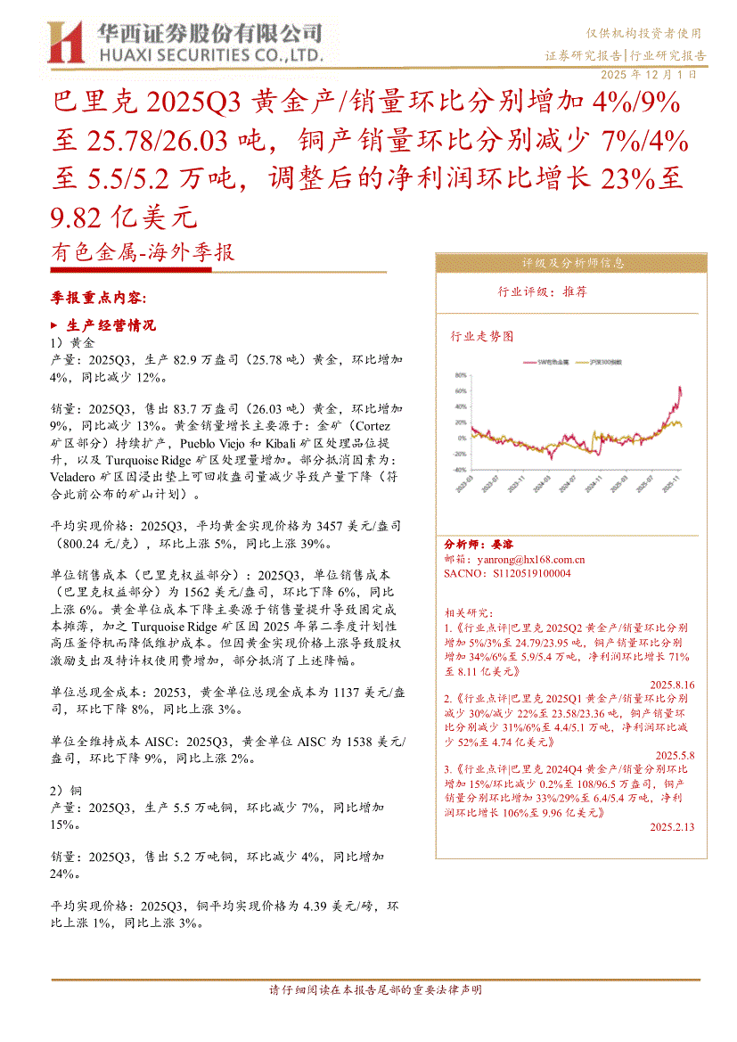 有色金属行业:华西证券-有色金属行业~海外季报:巴里克2025Q3黄金产/销量环比分别增加4%/9%至25.78/26.03吨,铜产销量环比分别减少7%/4%至5.5/5.2万吨,调整后的净利润环比增长23%至9.82亿美元-251201