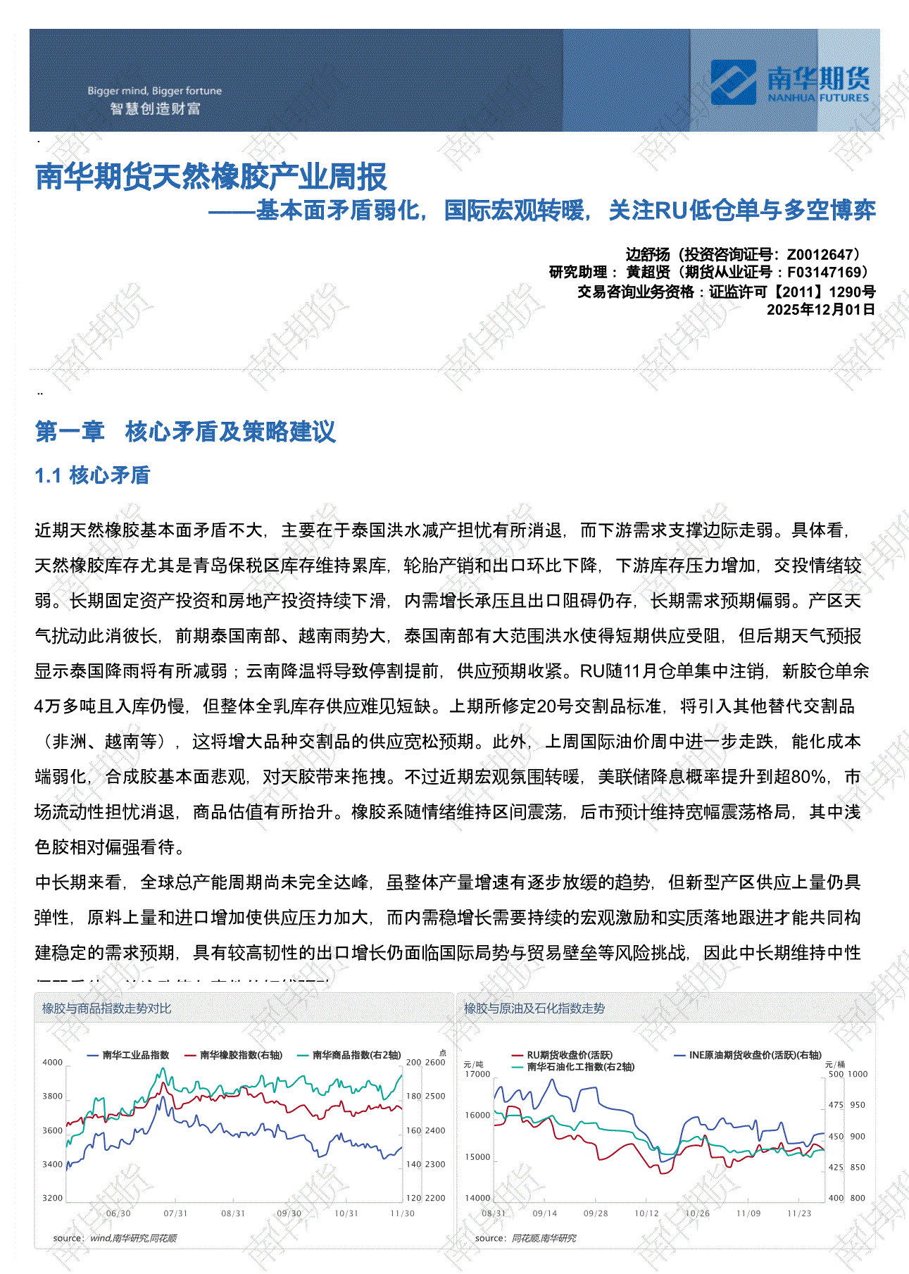 南华期货-天然橡胶产业周报:基本面矛盾弱化,国际宏观转暖,关注RU低仓单和多空博弈-251201
