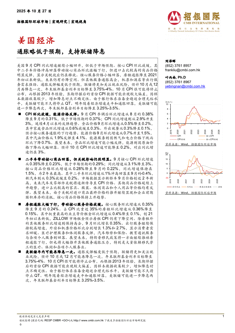 招银国际-美国经济:通胀略低于预期,支持联储降息-251027