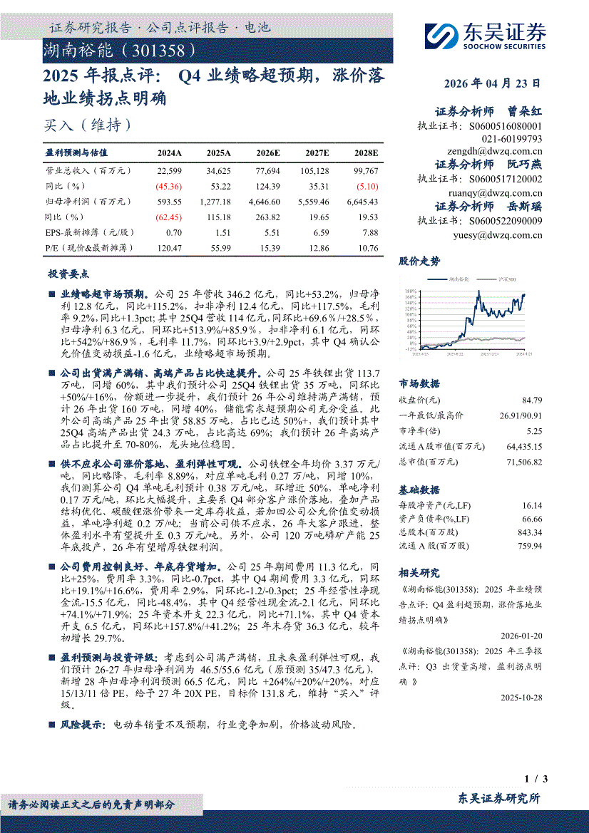 湖南裕能:东吴证券-湖南裕能-301358-2025年报点评:Q4业绩略超预期,涨价落地业绩拐点明确-260423