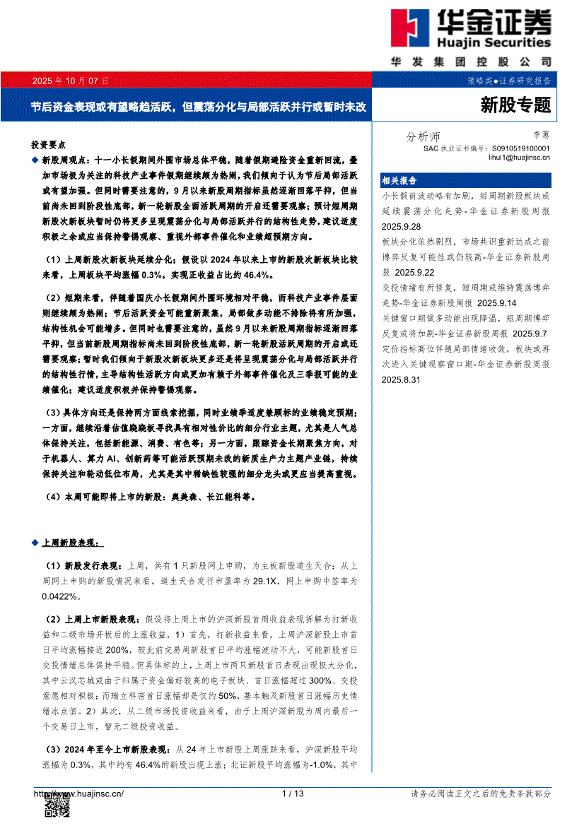 华金证券-新股专题:节后资金表现或有望略趋活跃,但震荡分化与局部活跃并行或暂时未改-251007