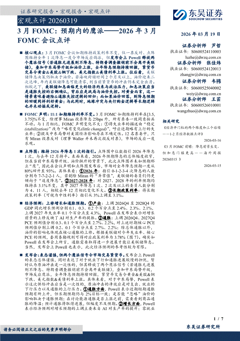 东吴证券-3月FOMC:预期内的鹰派——2026年3月FOMC会议点评-260319