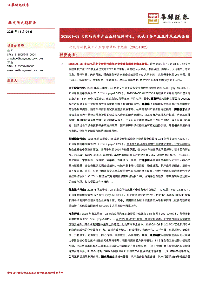 华源证券-北交所科技成长产业跟踪第四十九期(20251102):2025Q1~Q3北交所汽车产业业绩延续增长,机械设备产业业绩或止跌企稳-251104