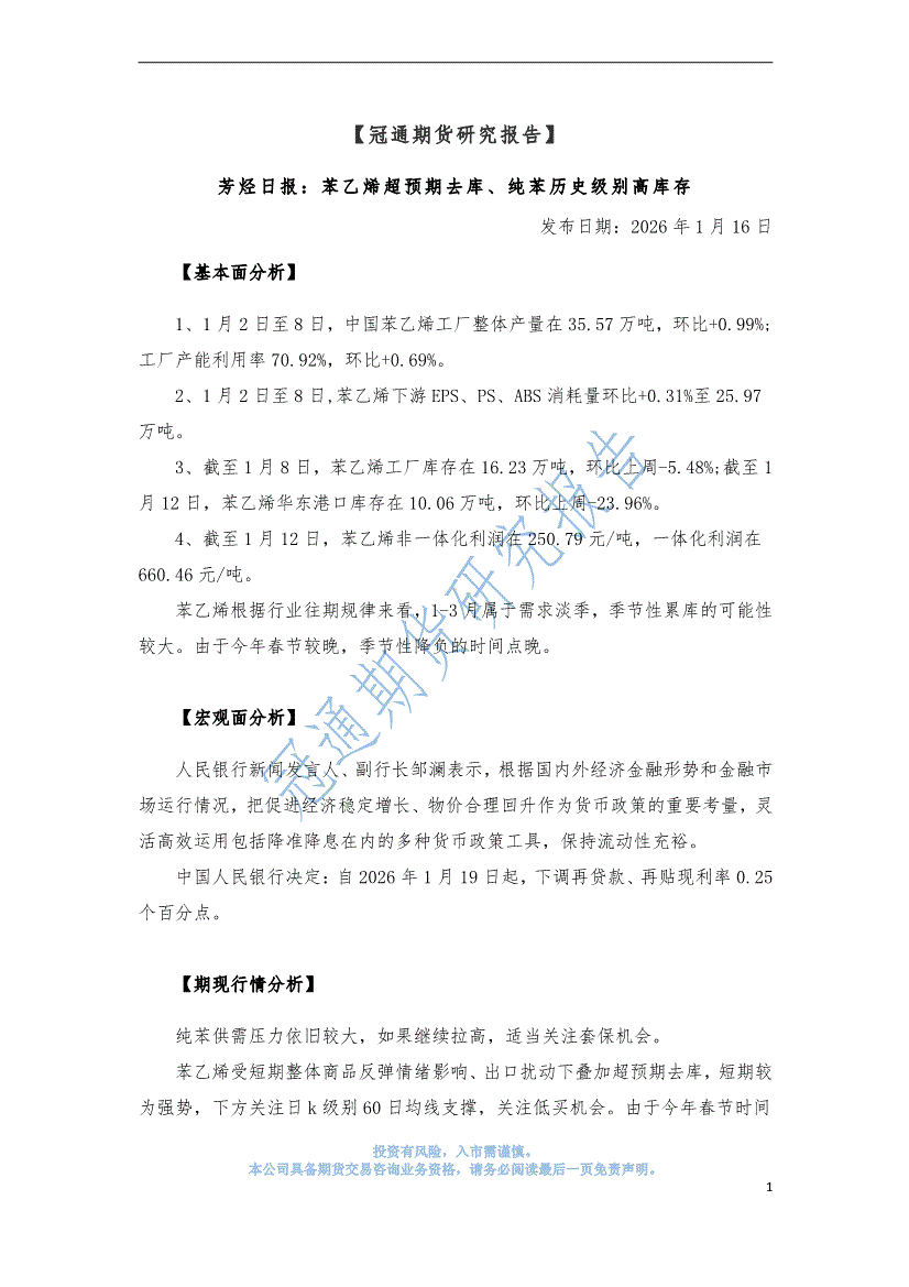 冠通期货-芳烃日报:苯乙烯超预期去库、纯苯历史级别高库存-260116