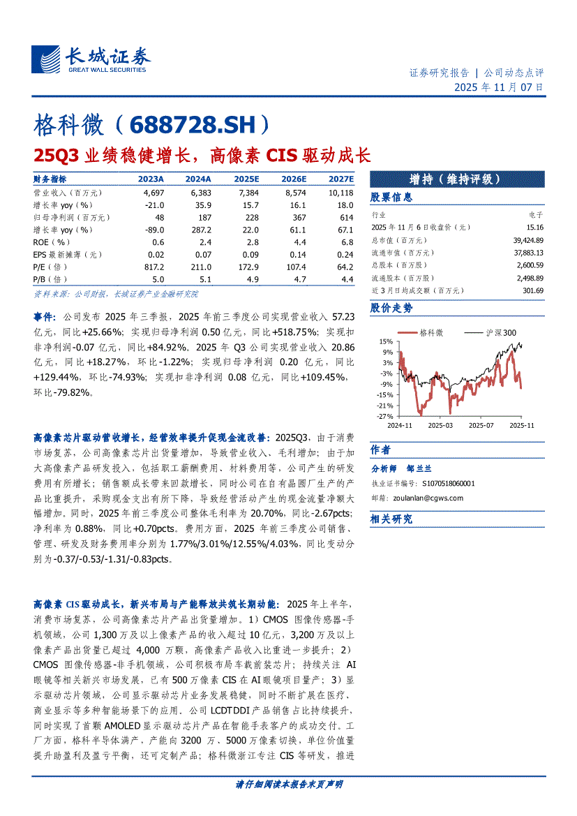格科微:长城证券-格科微-688728-25Q3业绩稳健增长,高像素CIS驱动成长-251107