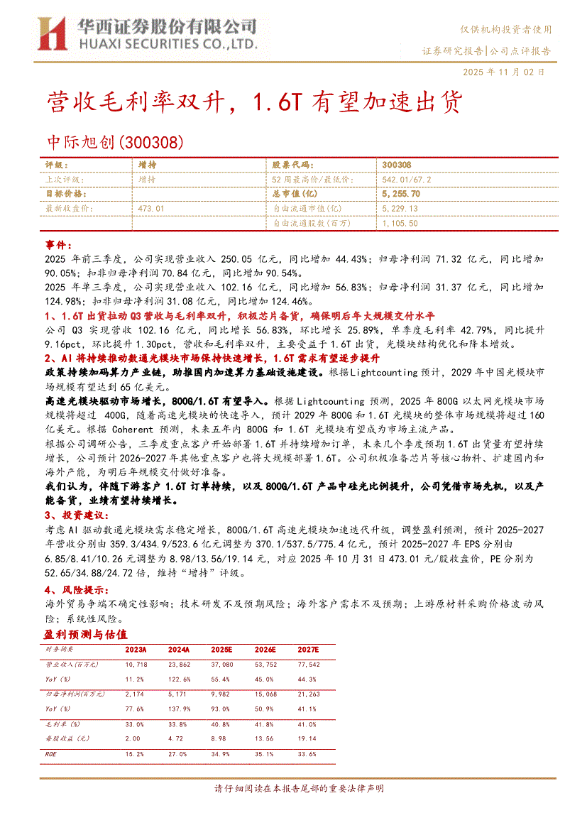 中际旭创:华西证券-中际旭创-300308-营收毛利率双升,1.6T有望加速出货-251102
