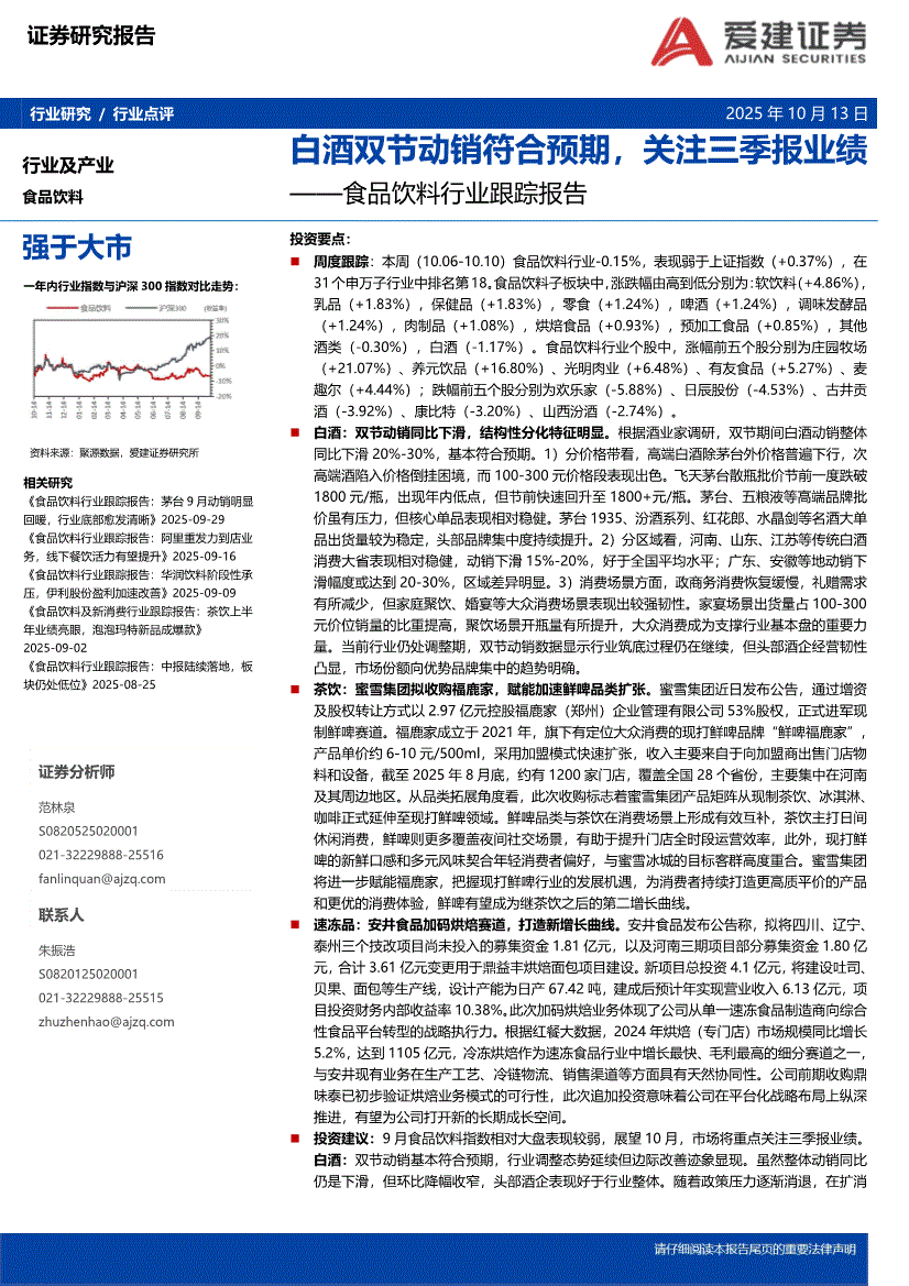 食品饮料行业:爱建证券-食品饮料行业跟踪报告:白酒双节动销符合预期,关注三季报业绩-251013