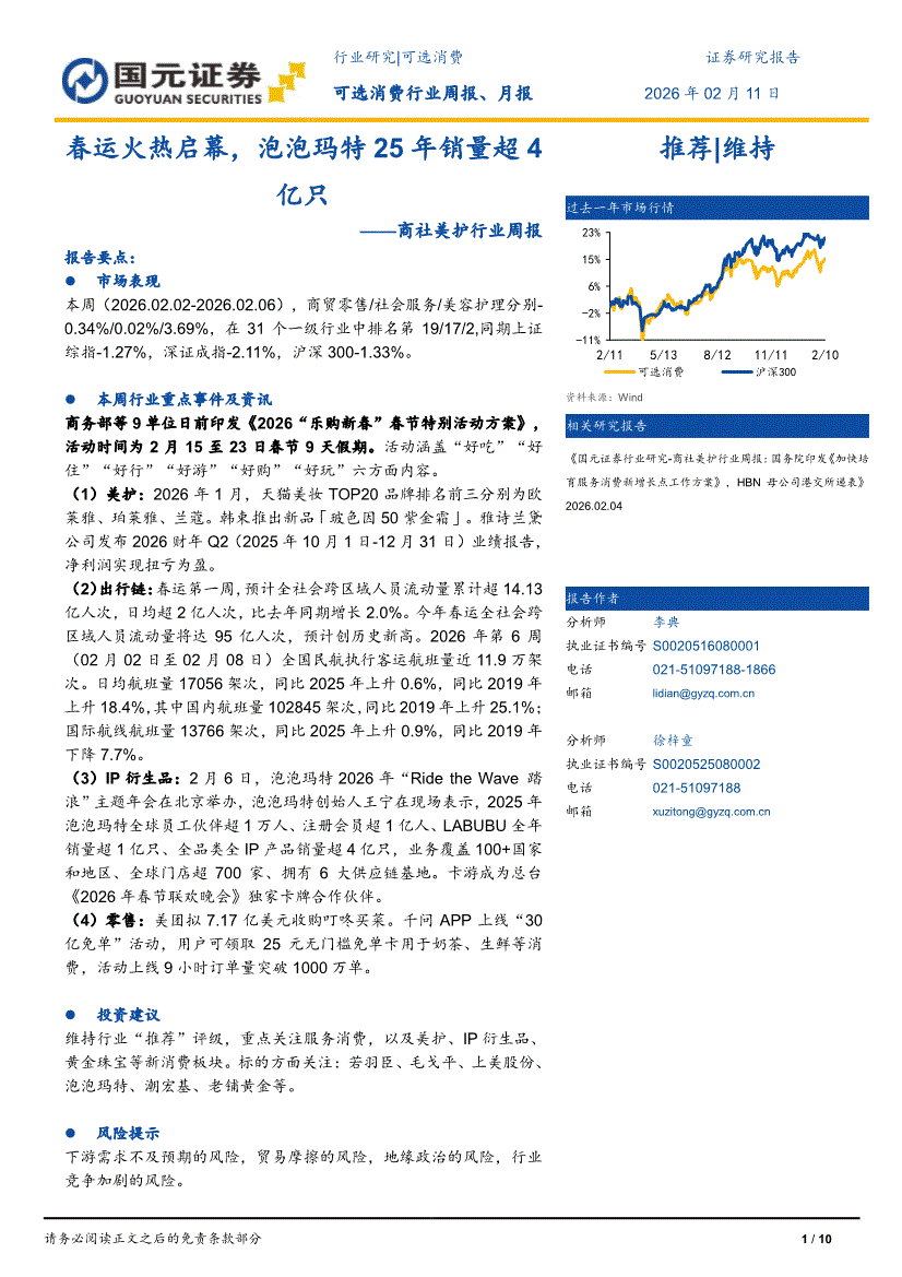 商社美护行业:国元证券-商社美护行业周报:春运火热启幕,泡泡玛特25年销量超4亿只-260211