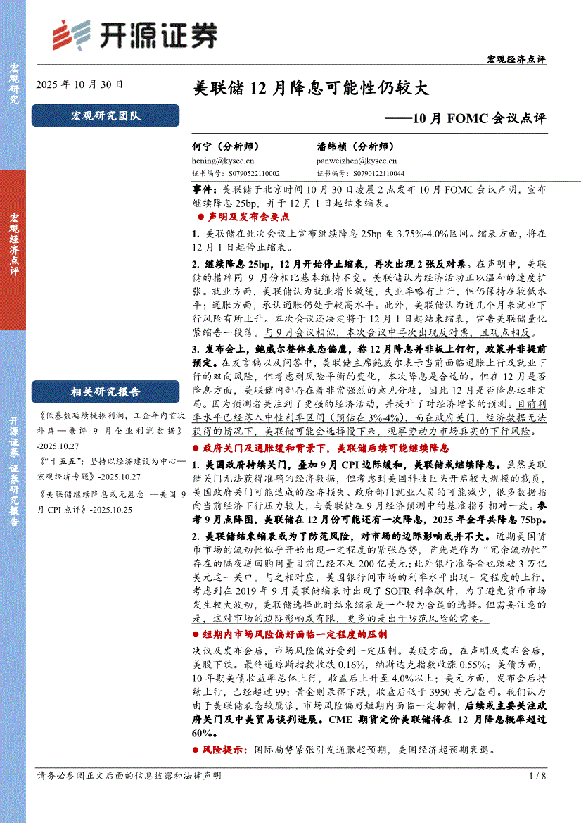 开源证券-10月FOMC会议点评:美联储12月降息可能性仍较大-251030