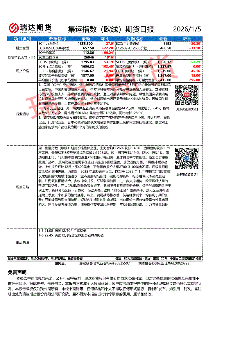 瑞达期货-集运指数(欧线)期货日报-260105