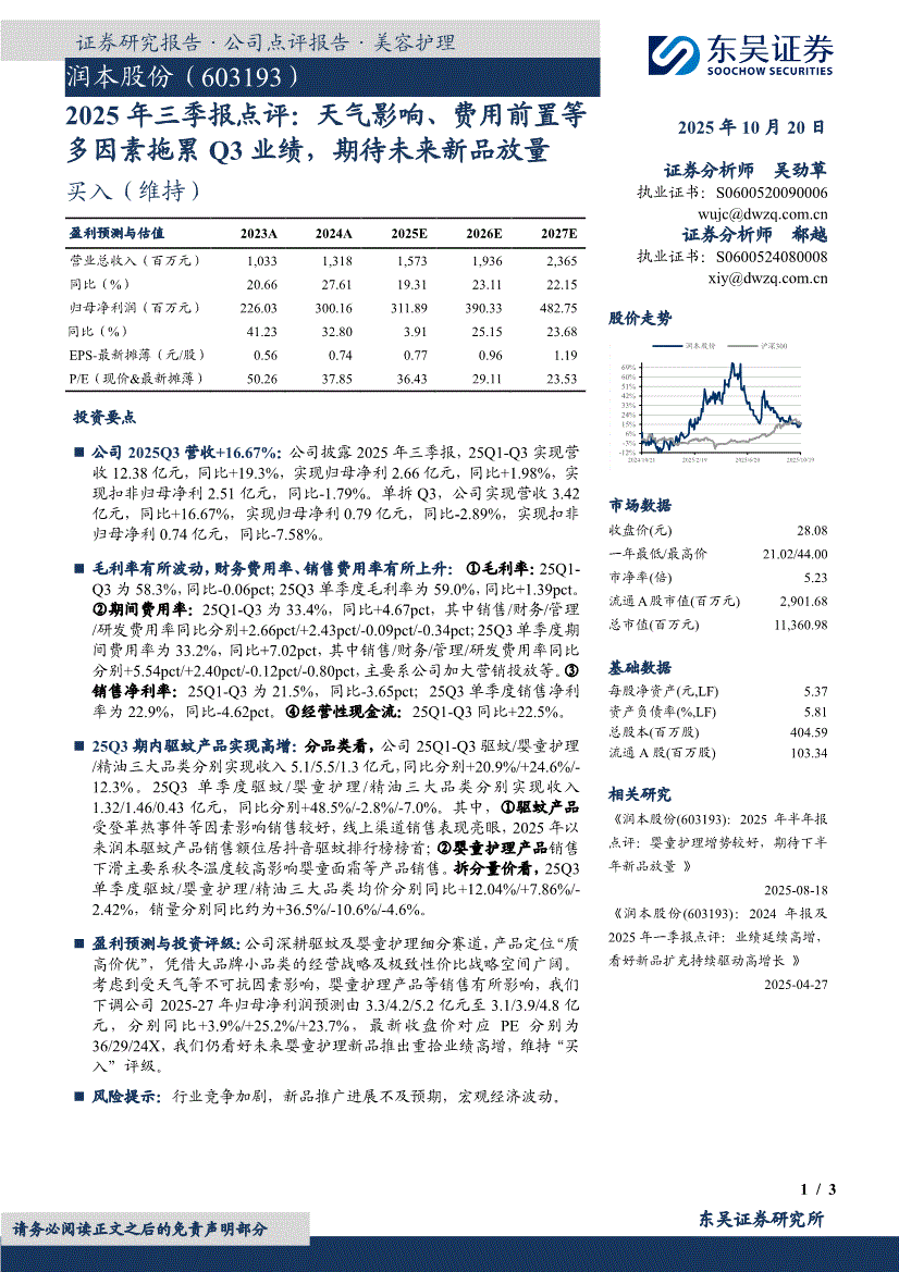 润本股份:东吴证券-润本股份-603193-2025年三季报点评:天气影响、费用前置等多因素拖累Q3业绩,期待未来新品放量-251020