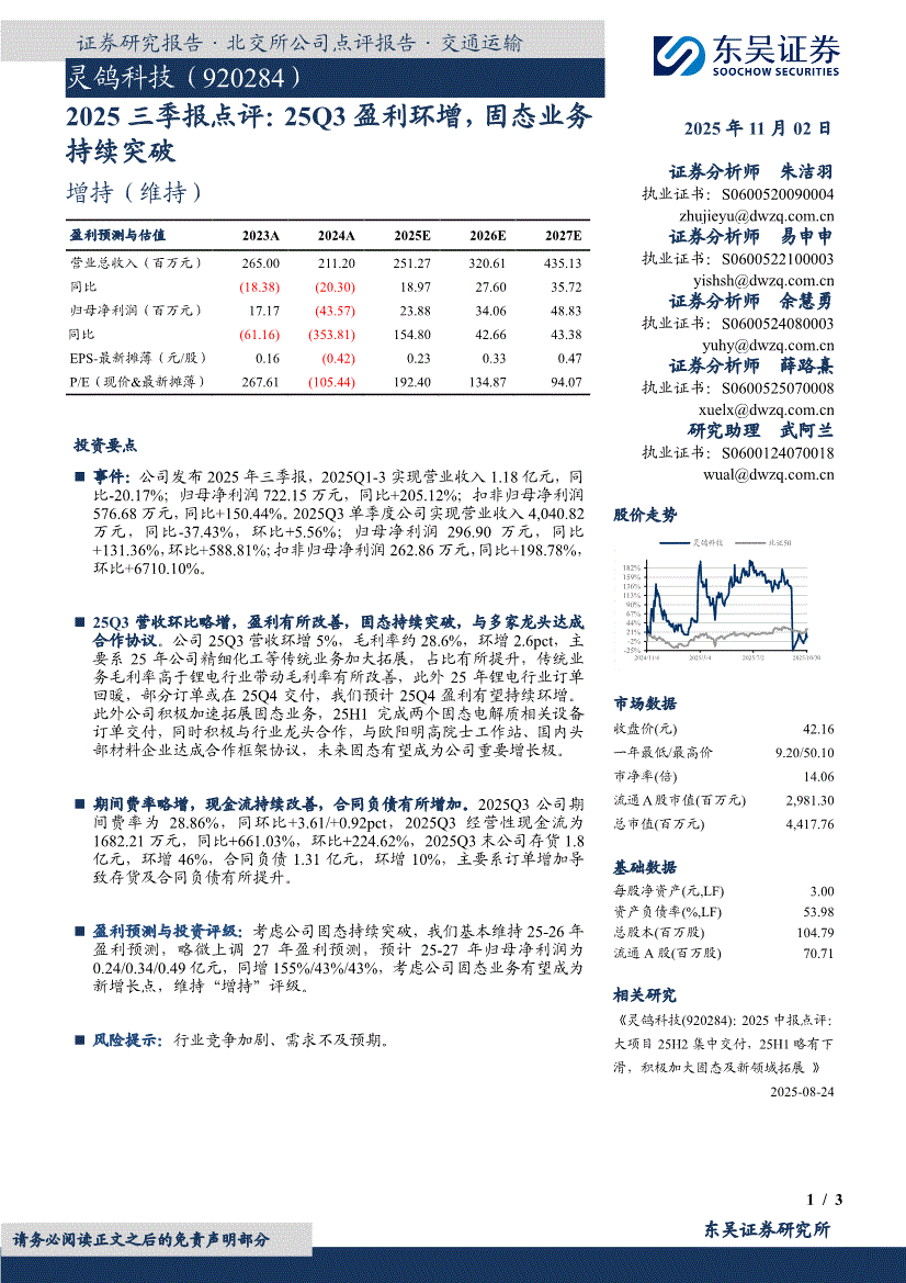 灵鸽科技:东吴证券-灵鸽科技-920284-2025三季报点评:25Q3盈利环增,固态业务持续突破-251102