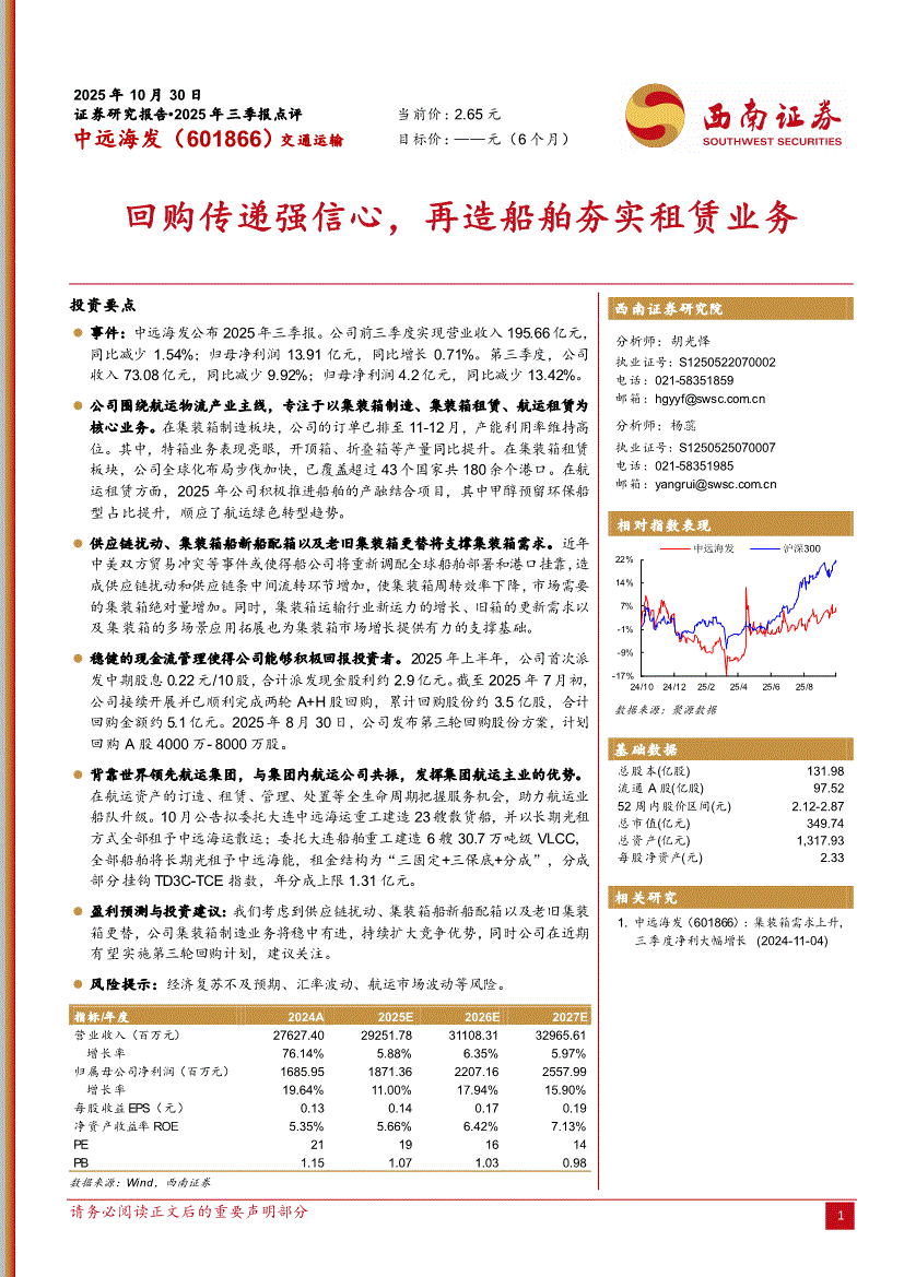 中远海发:西南证券-中远海发-601866-回购传递强信心,再造船舶夯实租赁业务-251030