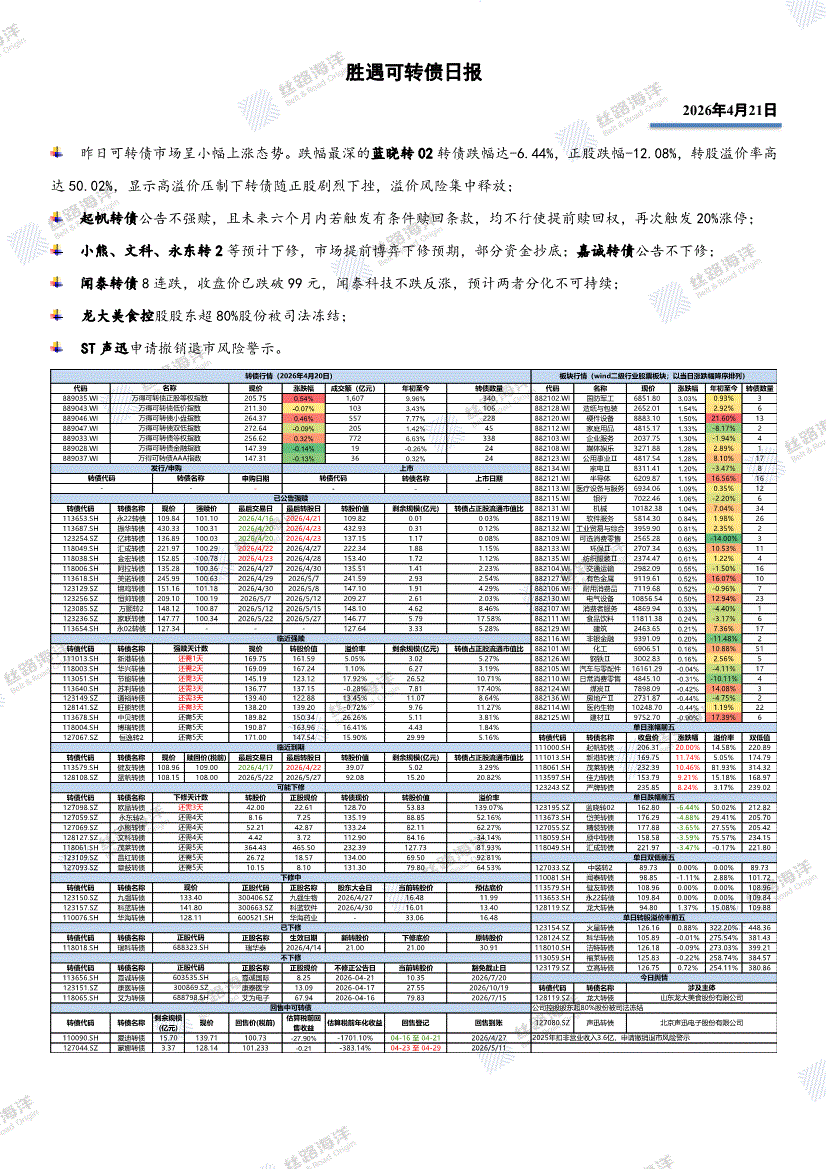 丝路海洋-胜遇可转债日报-260421