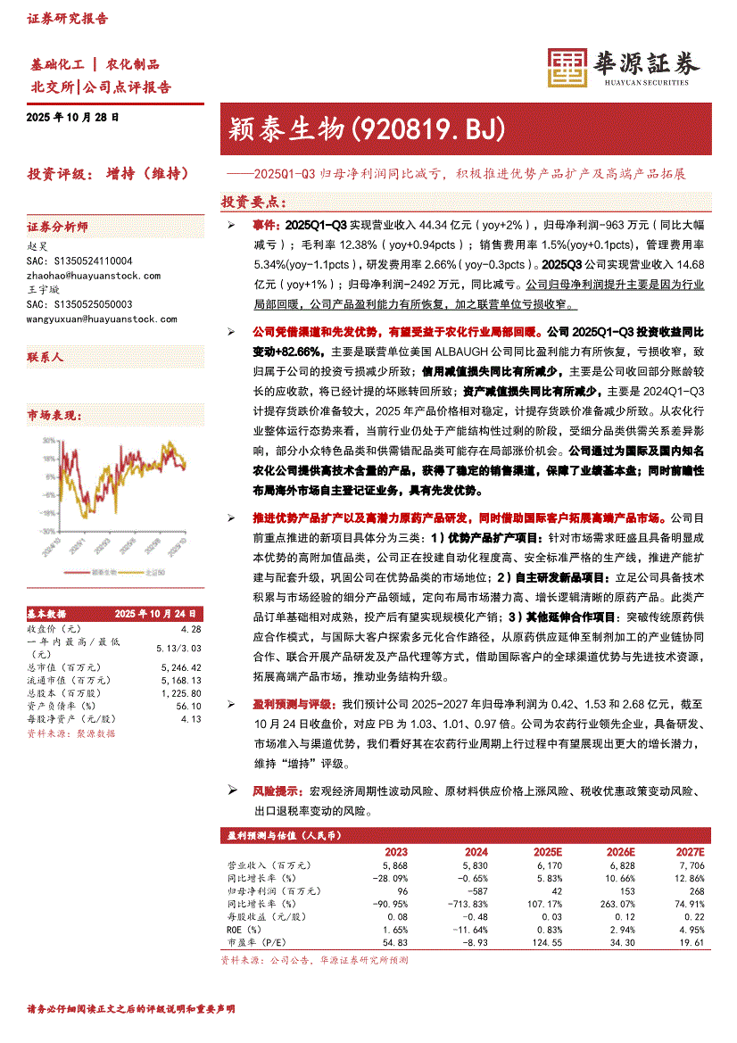 颖泰生物:华源证券-颖泰生物-920819-2025Q1~Q3归母净利润同比减亏,积极推进优势产品扩产及高端产品拓展-251028