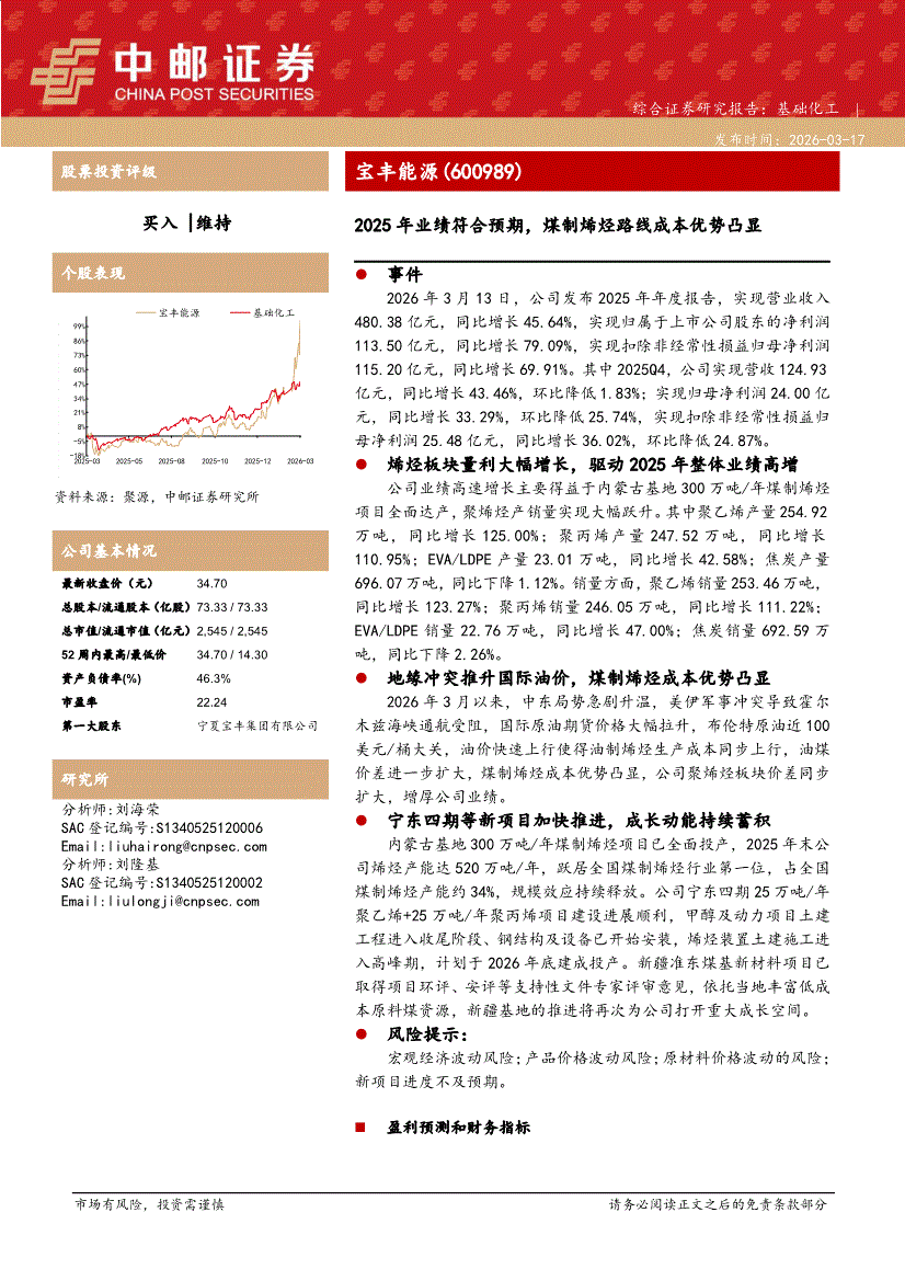 宝丰能源:中邮证券-宝丰能源-600989-2025年业绩符合预期,煤制烯烃路线成本优势凸显-260317