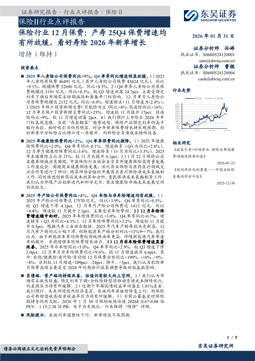 保险行业:东吴证券-保险行业12月保费:产寿25Q4保费增速均有所放缓,看好寿险2026年新单增长-260131